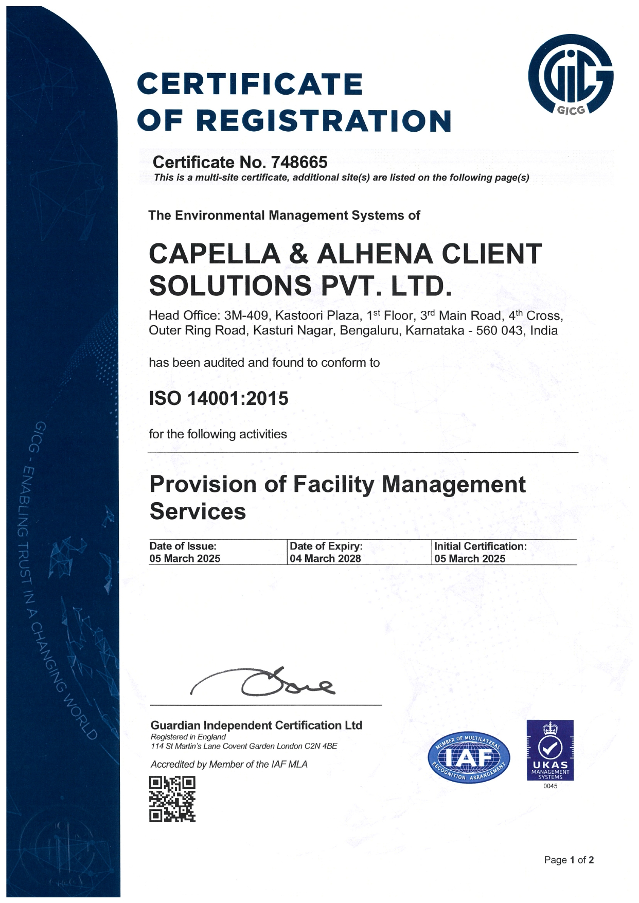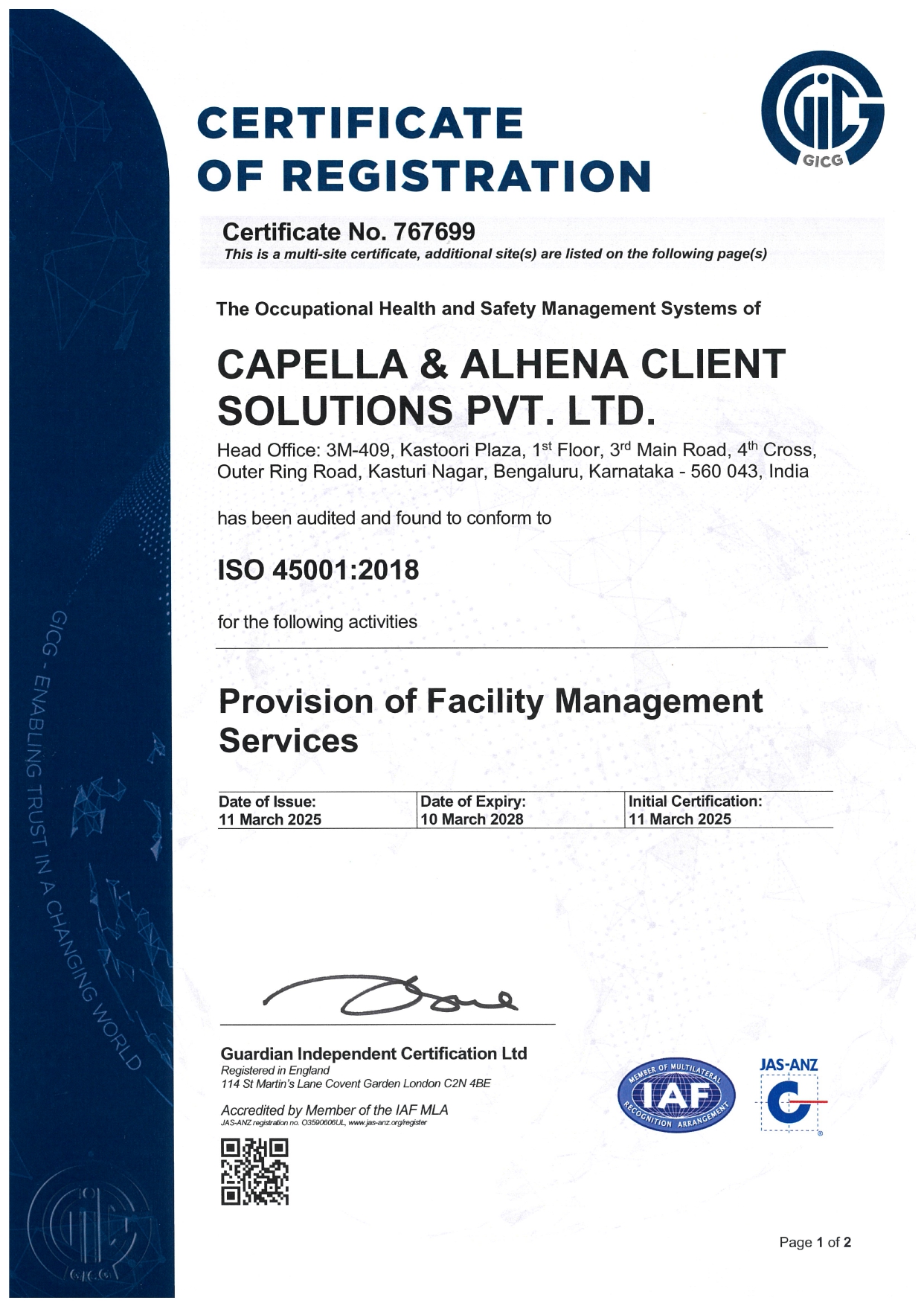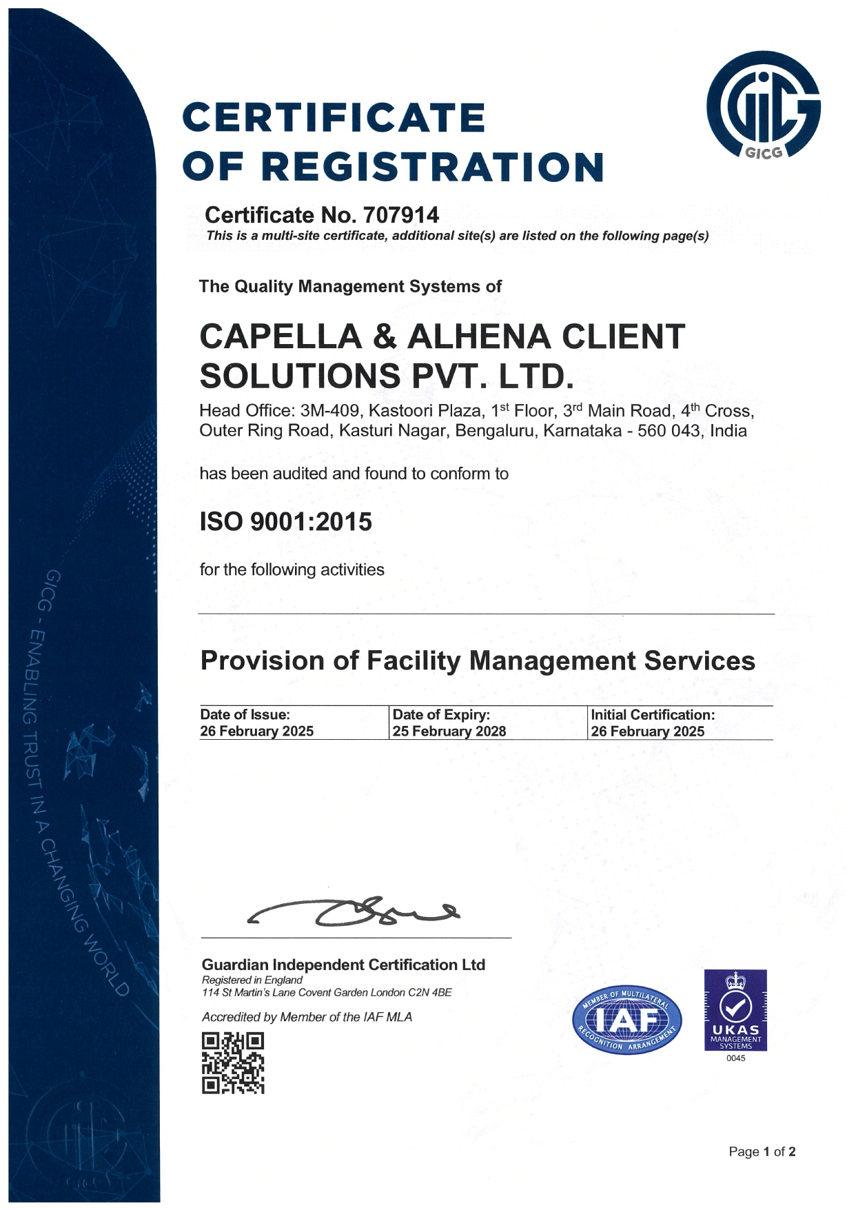 Capella & Alhena Client Solutions Pvt. Ltd. Is a professional service provider with an aim to provide a complete range of world-class integrated Facility Management Services, in major business sectors, backed by a Team with vast experience in facility management.
